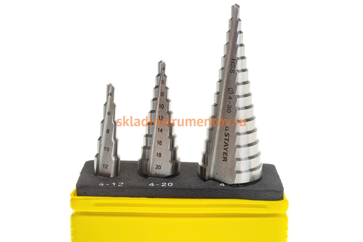 Набор ступенчатых сверл STAYER 29660-4-30-H3 предназначен для получения отверстий различного диаметра без перестановки режущего инструмента. Сверла изготовлены из быстрорежущей стали. Имеют трехгранный хвостовик.