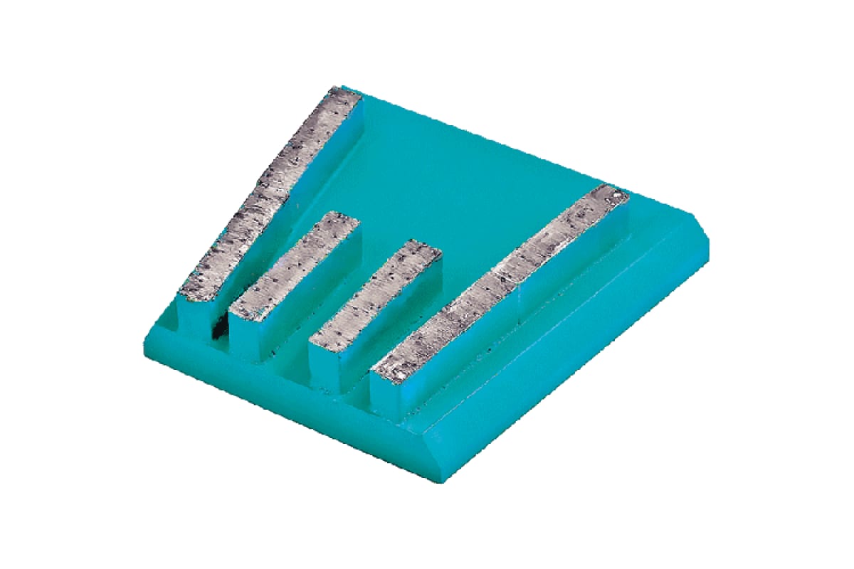 Франкфурт GFB 1 Адель КК06558 предназначен для мозаичных шлифовальных машин. Применяется для выглаживания поверхности бетона марок М100-350. Обеспечивает ровный пол с небольшими шероховатостями. Цвет – бирюзовый. Размер сегментов – 40х8х9 мм. Зернистость – 315/250 мкм или 50 грит. Ресурс – 1000 кв/м при снятии 1 мм обрабатываемой поверхности. Глубина царапин – 0.2 мм.