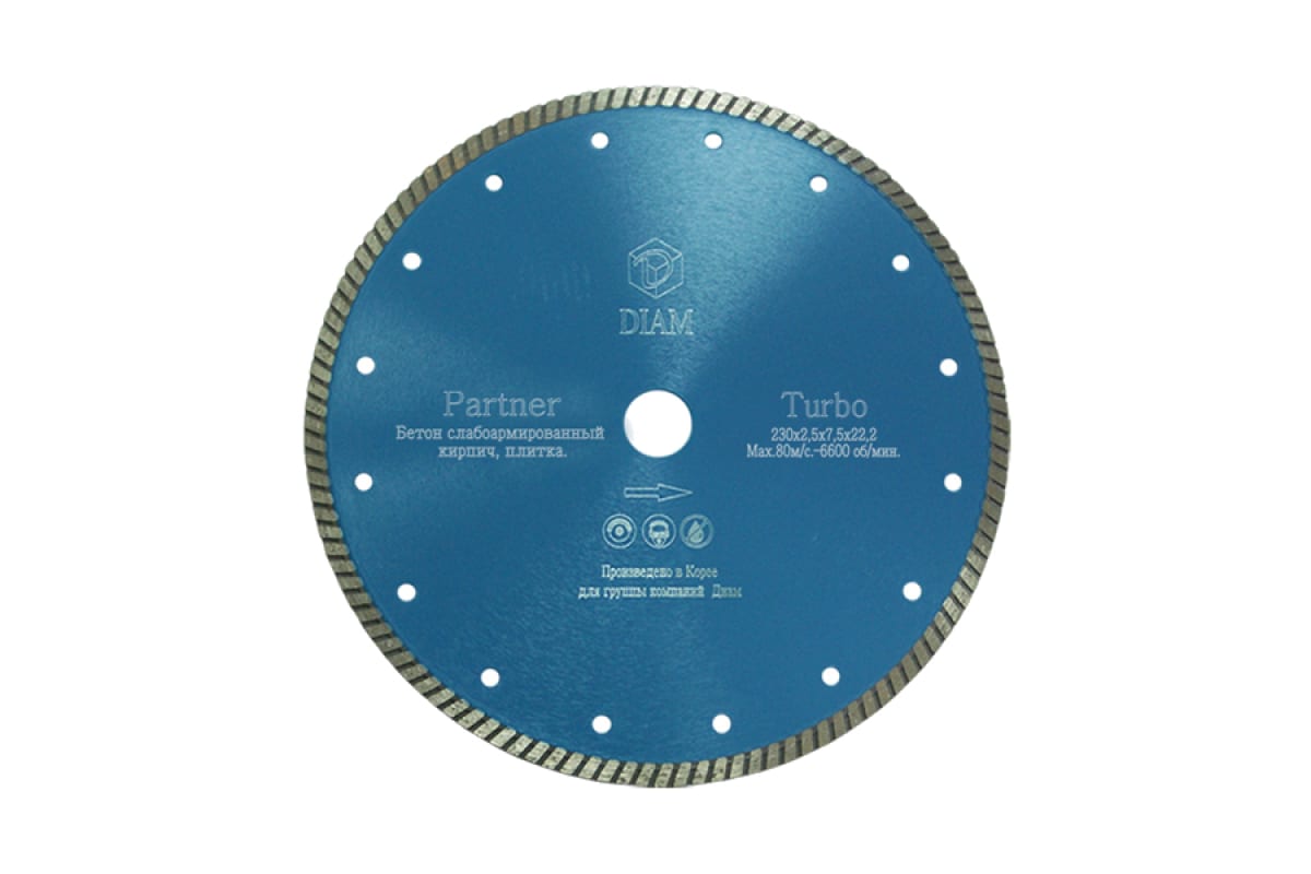 Алмазный диск серии Турбо Partner 000179 DIAM используется совместно с угловыми шлифмашинами при проведении строительных и ремонтных работ. Диск применяется для реза бетонных конструкций, тротуарной плитки, а также огнеупорных строительных материалов. Оснастка подходит для сухой резки, не требует принудительного водного охлаждения. Конструкция диска предусматривает алмазное напыление для максимальной прочности и надежности оснастки при работе, что обеспечивает высокую производительность. Высота алмазного слоя 7.5 мм.