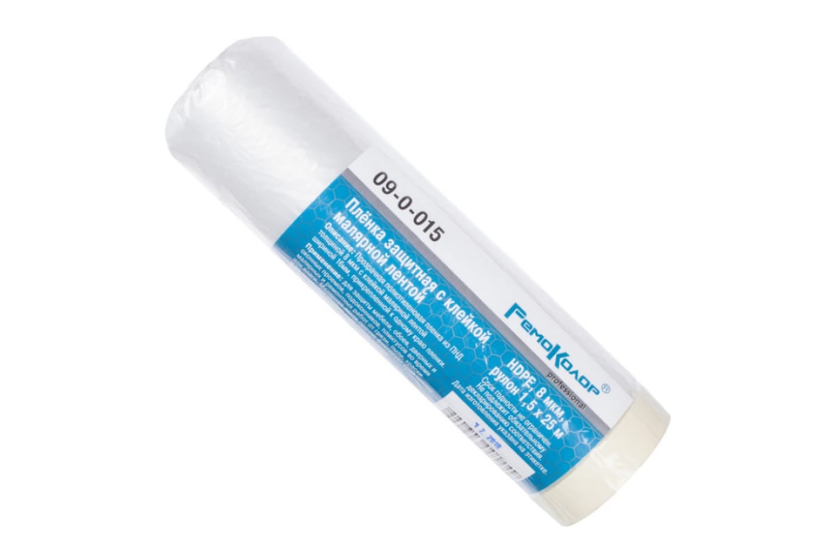 Изготовлена из полиэтилена низкого давления, оснащена клейкой малярной лентой шириной 16 мм. Малярная лента надежно закрепляет пленку, не оставляя следов клея.