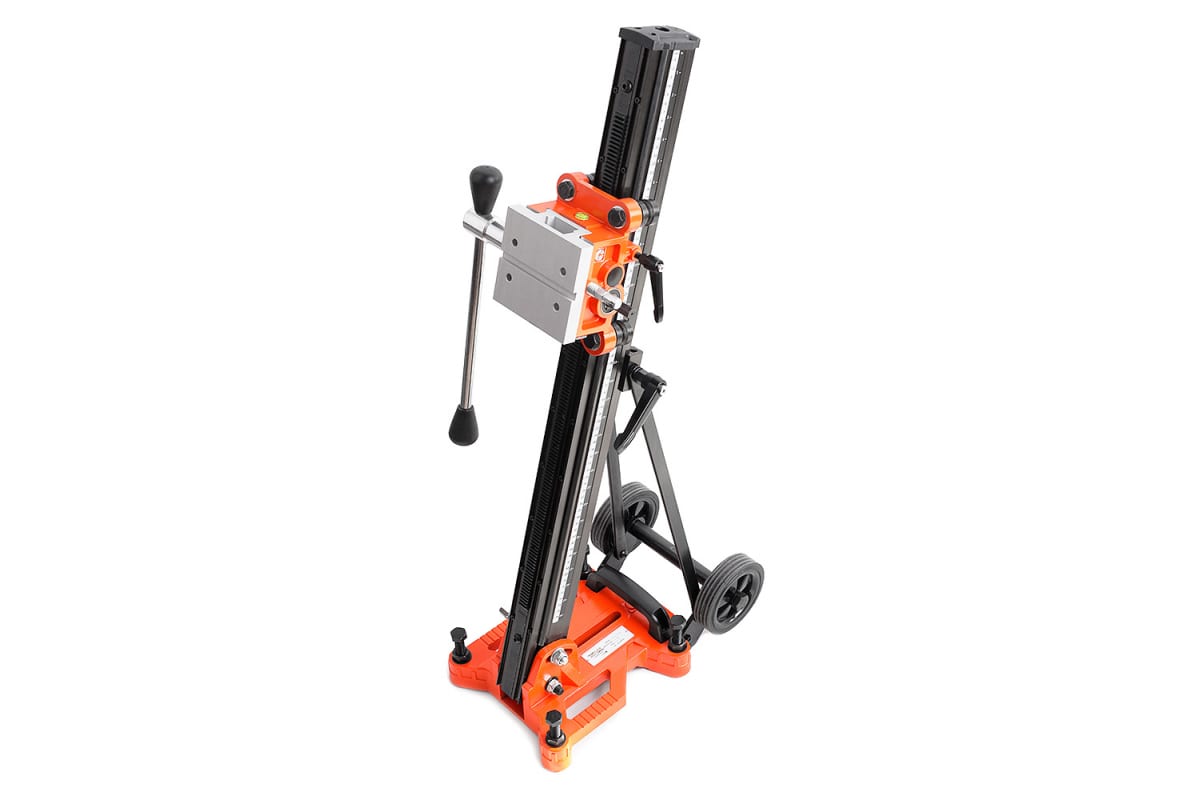 Стойка установки алмазного бурения с наклоном MESSER SМ-250 11-03-251 - прочная конструкция для работы с буровыми машинами. Устройство дает возможность зафиксировать двигатель под углом от 0 до 45 градусов. Стойка оснащается двумя колесами для легкой и удобной транспортировки. Рейка имеет измерительные деления, благодаря которым осуществляется контроль глубины сверления. Хомут каретки подходит для бурмашин с диаметром коронки до 250 мм, что позволяет справляться с таким высокопрочным материалом как армированный бетон.