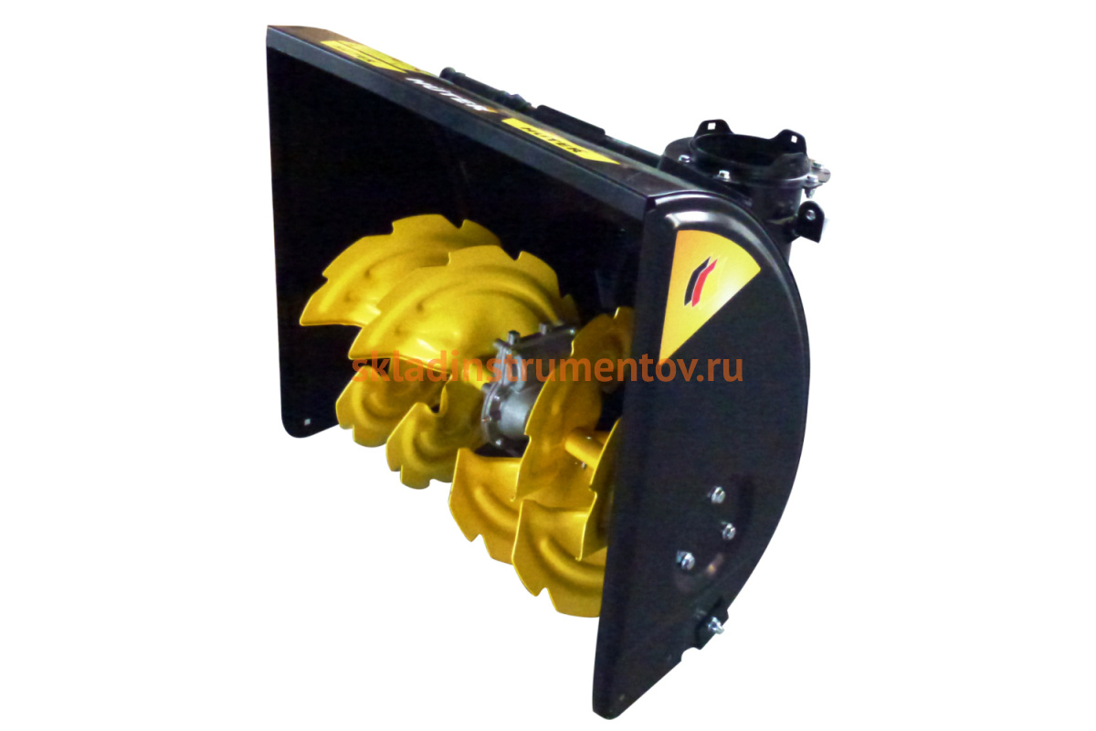 Конструкция насадки состоит из снегоуборочного ковша с металлическим шнеком и желобом для выброса снега. На желобе есть ручка регулировки направления и высоты выброса снега.