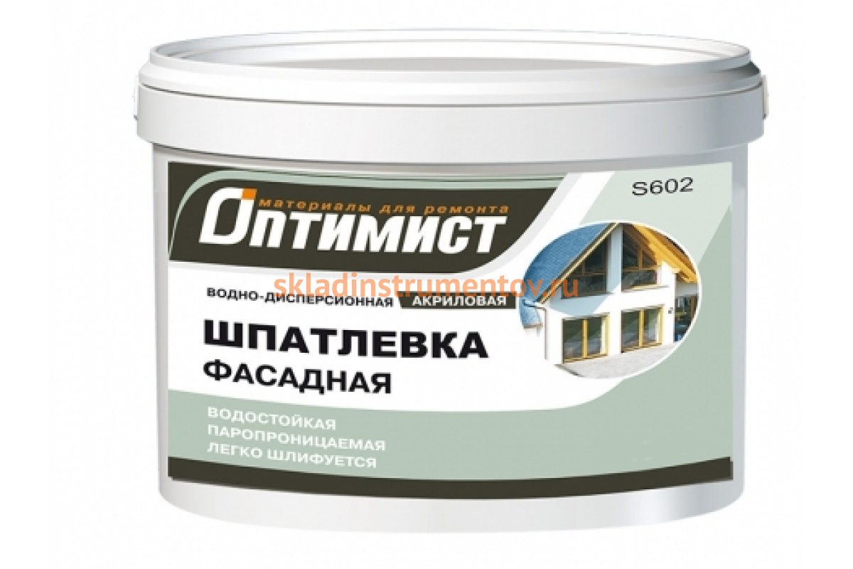 Шпатлевка фасадная S602 Оптимист 00-00001510 используется перед началом малярных работ. Служит для шпатлевания поверхностей фасадов зданий и интерьеров. Шпатлевка наносится на бетон, штукатурку, дерево, ДСП, кирпич, гипсокартон и т.д.