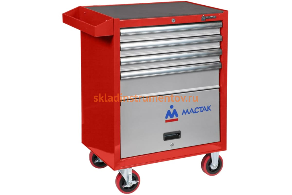 Тележка инструментальная (4 ящика и отсек, красная) МАСТАК 522-04581R разработана для хранения любого ручного инструмента. Предусмотрено 4 небольших ящика и объемный отсек для хранения. Изделие выполнено из листовой стали, что обеспечивает надежность и жесткость конструкции. В верхней части располагается удобная ручка-карман, которая также может использоваться для текущего хранения небольших предметов. Максимальная допустимая нагрузка на каждую полку составляет 20 килограммов. С учетом дополнительного оборудования в отсеке общая нагрузка не должна превышать 450 килограммов. Имеется возможность промаркировать каждый ящик при помощи картона и защитной ленты. Корпус и отделения окрашены: внешнее покрытие устойчиво к ударам, ящики комплектуются защитными ковриками из вспененной резины. Перемещение обеспечивается за счет четырех колес: два поворотные, дополнительно оснащены блокировочным тормозом.