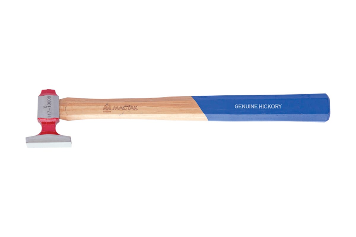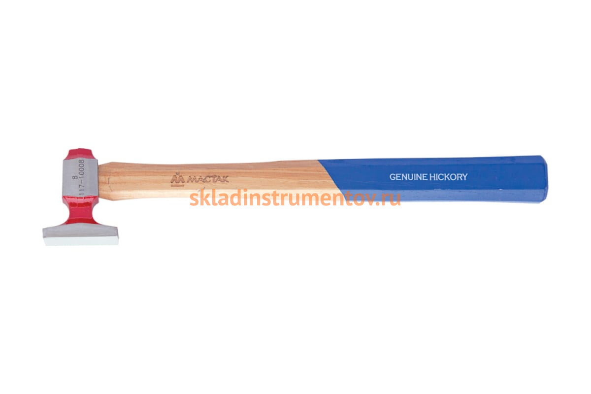 Рихтовочный молоток МАСТАК №8 117-10008 используется в автосервисах, гаражах и автомастерских. Его основное назначение - выравнивание кузовных деталей автомобиля. Рабочая часть инструмента выполнена из прочной стали и оснащена гладким квадратным бойком. Молоток имеет длинную деревянную рукоятку, которая удобно лежит в руке и обеспечивает комфортную работу.