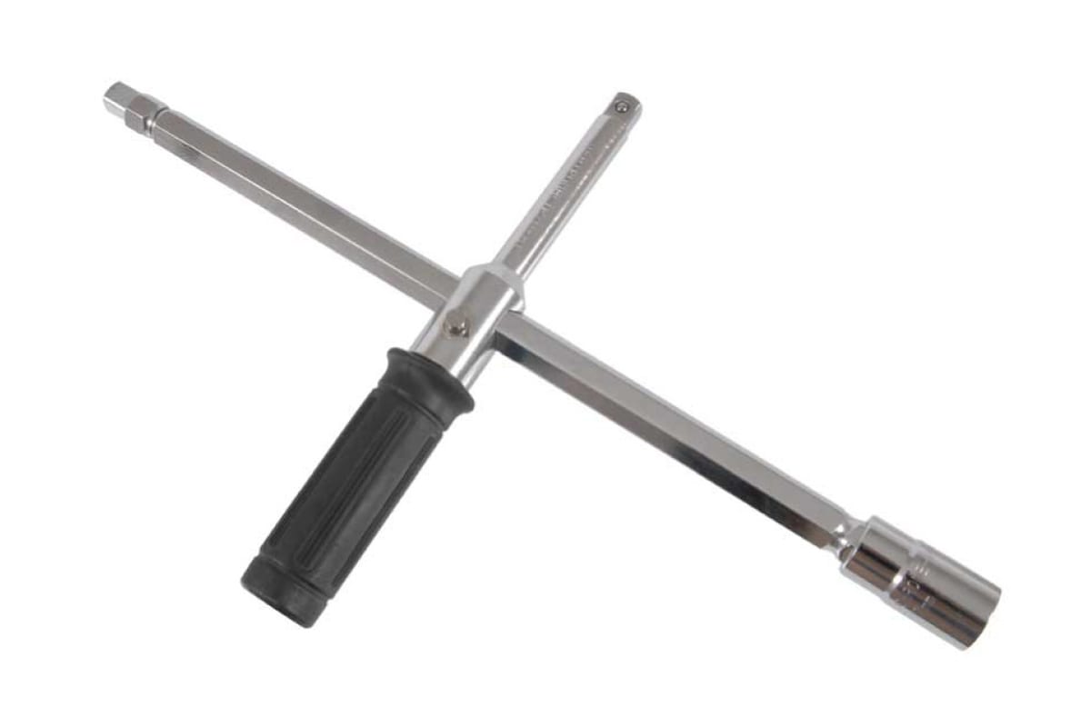 Баллонный ключ, 17х19,21х23 Центроинструмент 0723-2-2 используется для смены автомобильных колес в автосервисе или в экстренной ситуации на дороге. Выполнен из прочного металла, состоит из двух стержней, одни из которых оснащен резиновой ручкой и замком жесткой фиксации. Комплектуется с двумя головками размером 17х19 и 21х23, а также холщовым чехлом для удобного хранения и транспортировки.