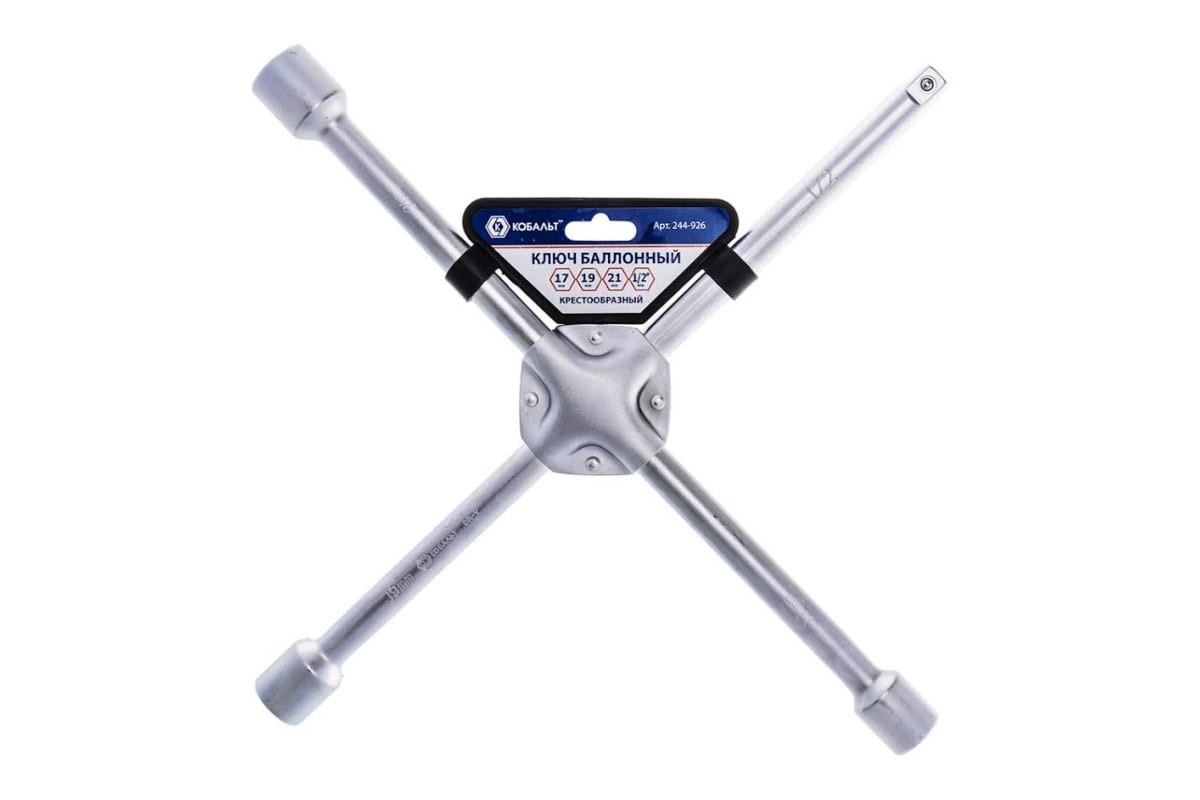 Баллонный крестообразный ключ 17, 19, 21, 1/2, 400мм, CR-V КОБАЛЬТ 244-926 используется в шиномонтажных мастерских для снятия и установки колесных дисков при смене колес автомобиля. Изделие имеет прочную конструкцию из хромованадиевой стали. Длина ключа составляет 40 см. Размеры: 17, 19, 21 мм и 1/2".