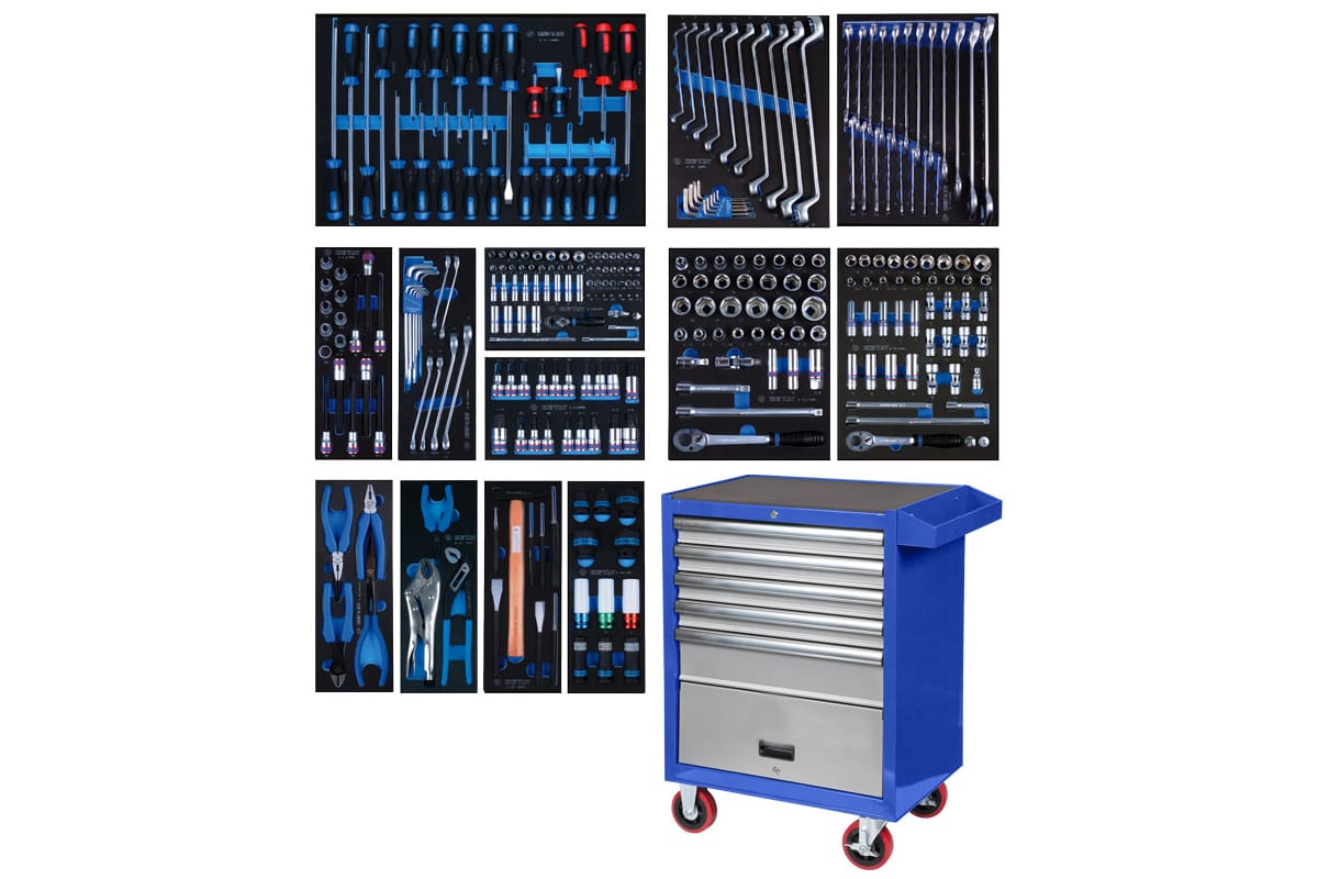 Набор инструментов в синей тележке 286 предметов KING TONY 934-010MMB позволяет организовать рабочее пространство автомобильной или шиномонтажной мастерской, производственного помещения, а также гаража. Приспособления размещены на 13 ложементах, которые можно расположить на полках тележки в зависимости от типа, назначения и других требований пользователя. Данный набор обладает широким размерным рядом, что дает возможность демонтажа и установки самого различного крепежа.