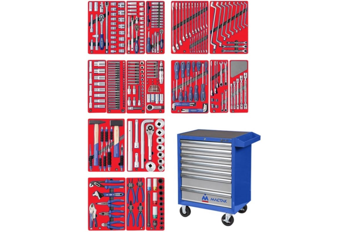Набор инструментов ЭКСПЕРТ 323 предмета МАСТАК 52-07323B в синей тележке находит применение в автосервисах при проведении ремонтных работ различной сложности. Преимущество набора заключается в его полноте. Всего предоставляется 17 ложементов, которые разложены по полкам инструментальной тележки. Безопасность хранения обеспечивается центральным замком. Корпус тележки выполнен из прочной листовой стали, внутри располагаются ребра жесткости. В верхней части располагается небольшое отделение для крепежа и мелочей.