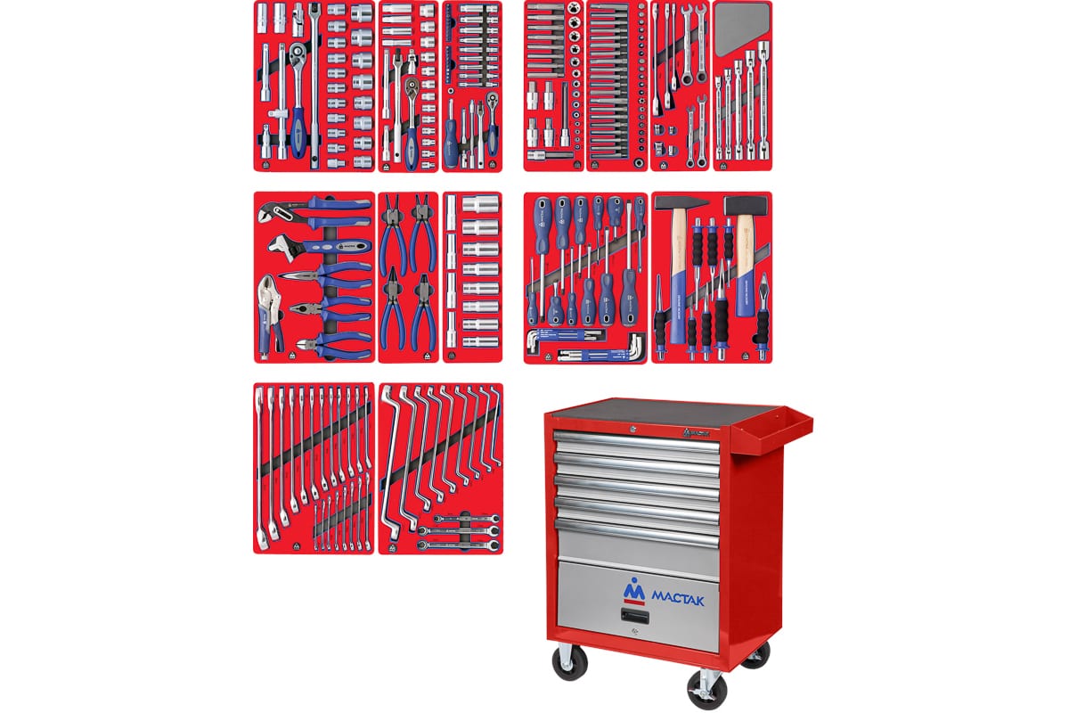 Набор инструментов ЛИДЕР в красной тележке, 270 предметов МАСТАК 52-270R - это отличное решение для любой авторемонтной мастерской или для небольшого производства. Все инструменты поставляются в индивидуальных ложементах, изготовленных из этиленвинилацетата (EVA), отличающегося легкостью, стойкостью к техническим жидкостям и различным деформациям (возвращает первоначальную форму).