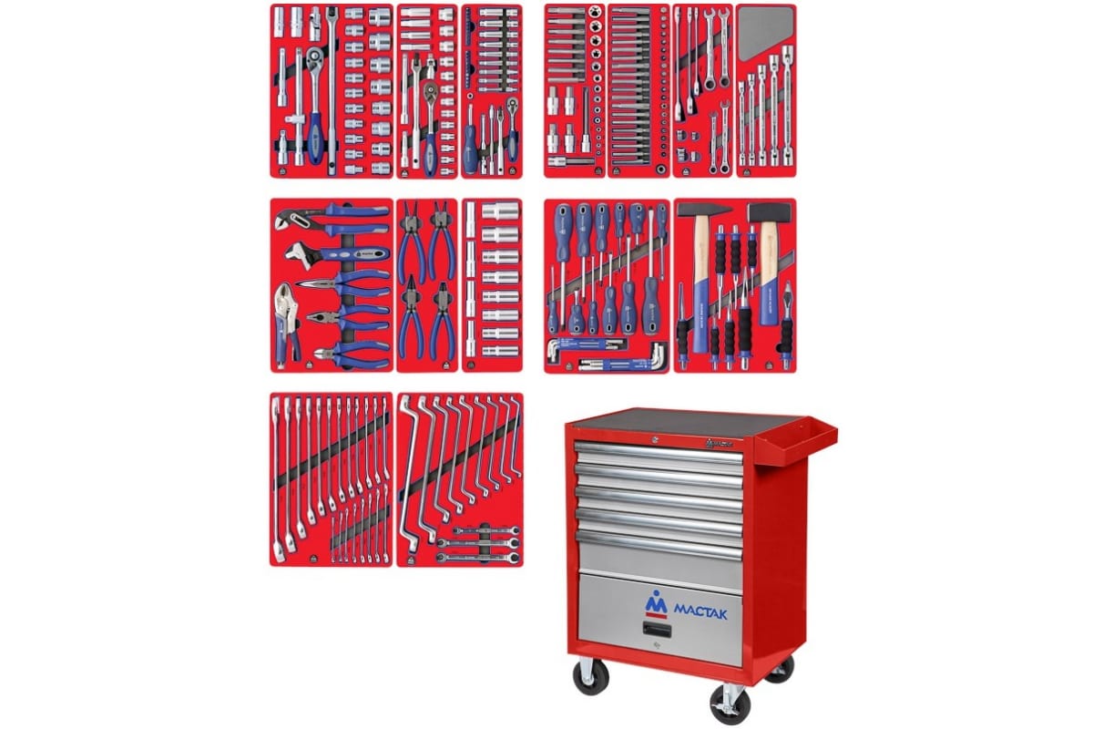 Набор инструментов "ЛИДЕР" 270 предметов МАСТАК 52-05270R в красной тележке включает необходимый комплект автомобильного оборудования и инструмента. Весь набор занимает 5 ящиков в тележке: отсек для хранения остается свободным и может заполняться по усмотрению владельца. Ложементы выполнены из легкого и прочного ЭВА, устойчивого к маслам и растворителям. Дополнительную прочность придает пластик на поверхности ложемента.