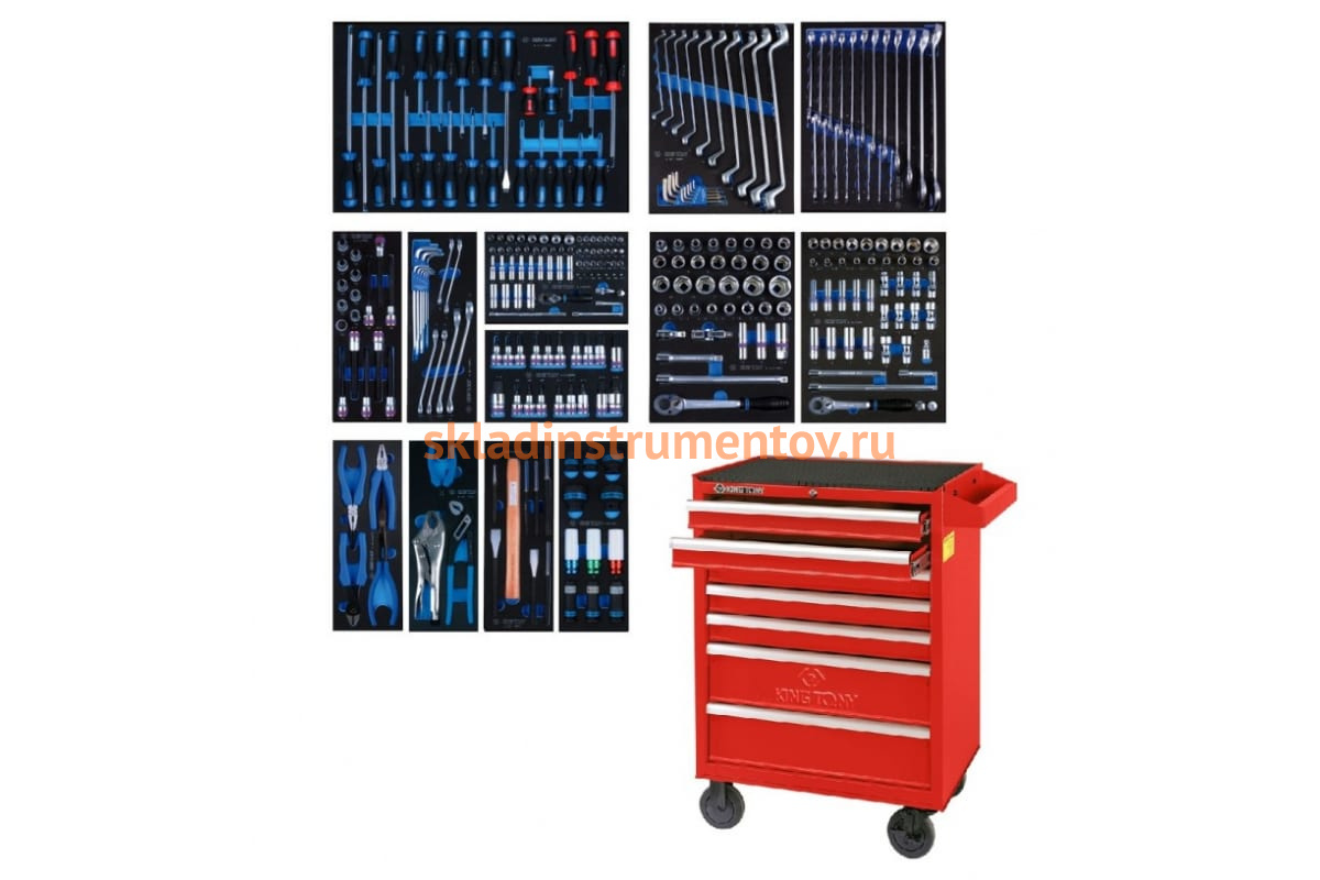 Набор инструментов в красной тележке, 286 предметов KING TONY 934-010MRV состоит из 13 ложементов, в которых размещены 286 предметов. Инструменты пригодятся на станции технического обслуживания, в автосервисах и на производстве.