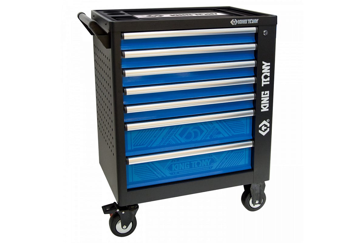 Инструментальная тележка KING TONY 7 ящиков, черная, P87G35-7B-KB01 оснащена колесами, в том числе поворотными. Изделие выполнено из прочной листовой стали. Дополнительное окрашивание защищает от коррозии и увеличивает срок службы.