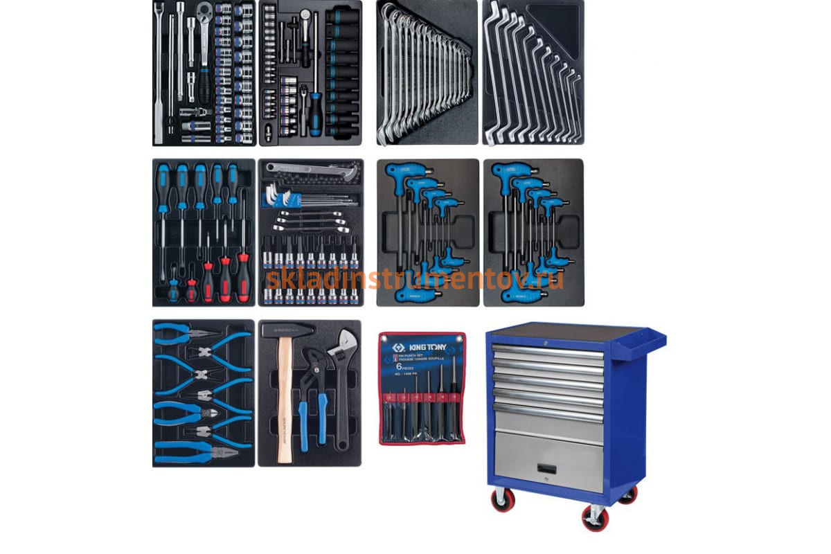 Набор инструментов в синей тележке (173 предмета) KING TONY 932-000MMB находит применение в автомастерских, на станциях технического обслуживания. 10 ложементов и виниловый чехол позволяют хранить все инструменты и приспособления на своих местах и, соответственно, быстро находить нужный элемент комплекта. Габариты тележки составляют 680х460х955 мм.