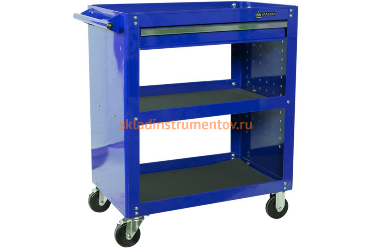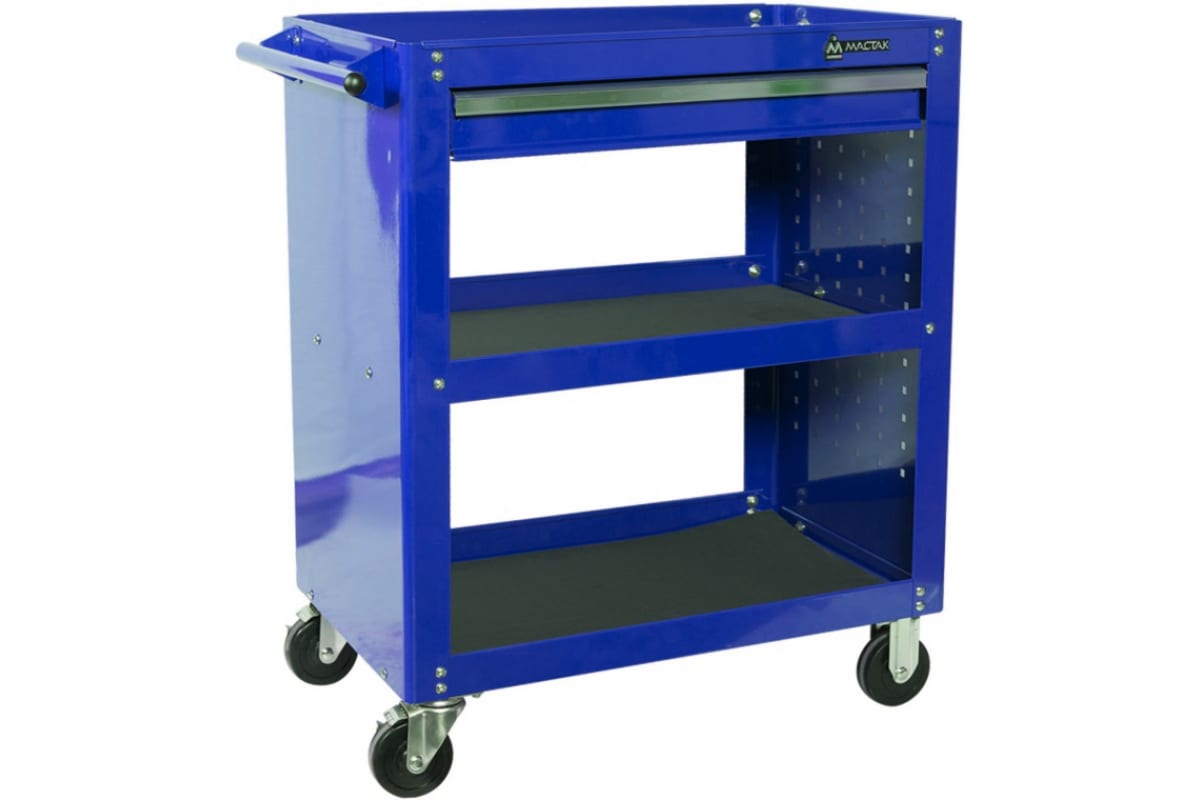 Открытая тележка, 3 полки и ящик, синяя МАСТАК 520-01580B используется для организации рабочего места как для мастера-профессионала, так и частного ремонтника в автослесарной мастерской. Открытые полки обеспечивают легкий доступ к необходимым инструментам и приспособлениям, что делает рабочий процесс удобным и эффективным.