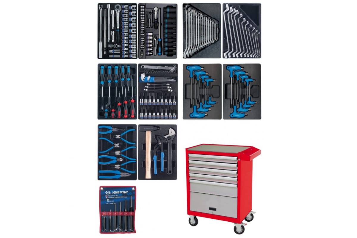 Набор инструментов в красной тележке, 173 предмета KING TONY 932-000AMR включает в себя набор выколоток в виниловом чехле и 10 ложементов. Инструменты подобраны оптимально и пригодятся на производстве, автомастерской и на станциях технического обслуживания.