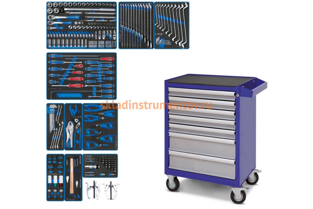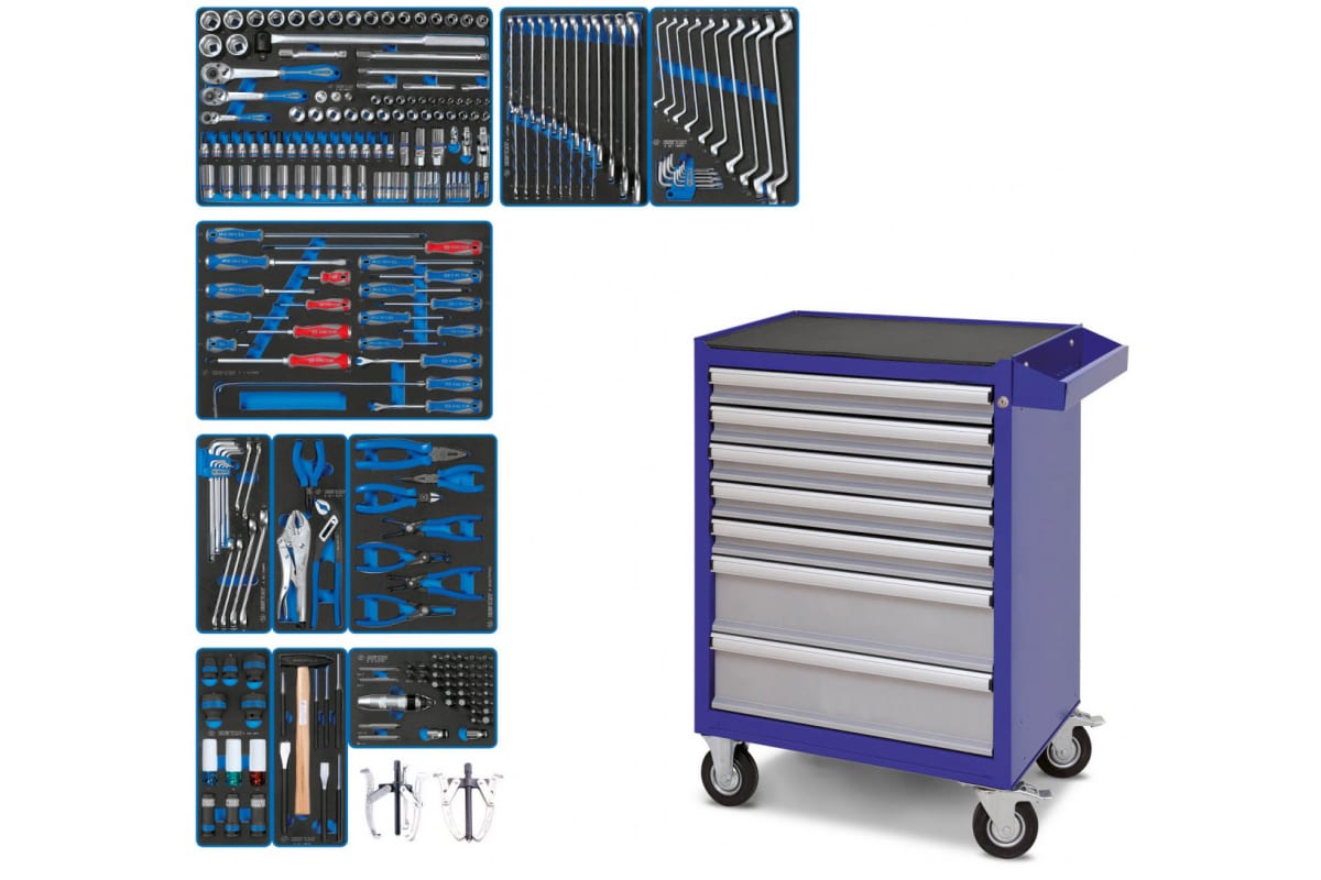 Набор инструментов KING TONY "DRIVE" в синей тележке, 251 предмет 934-251AMB представлен в расширенной комплектации и содержит 251 предмет. Предусмотрен для профессионального использования.