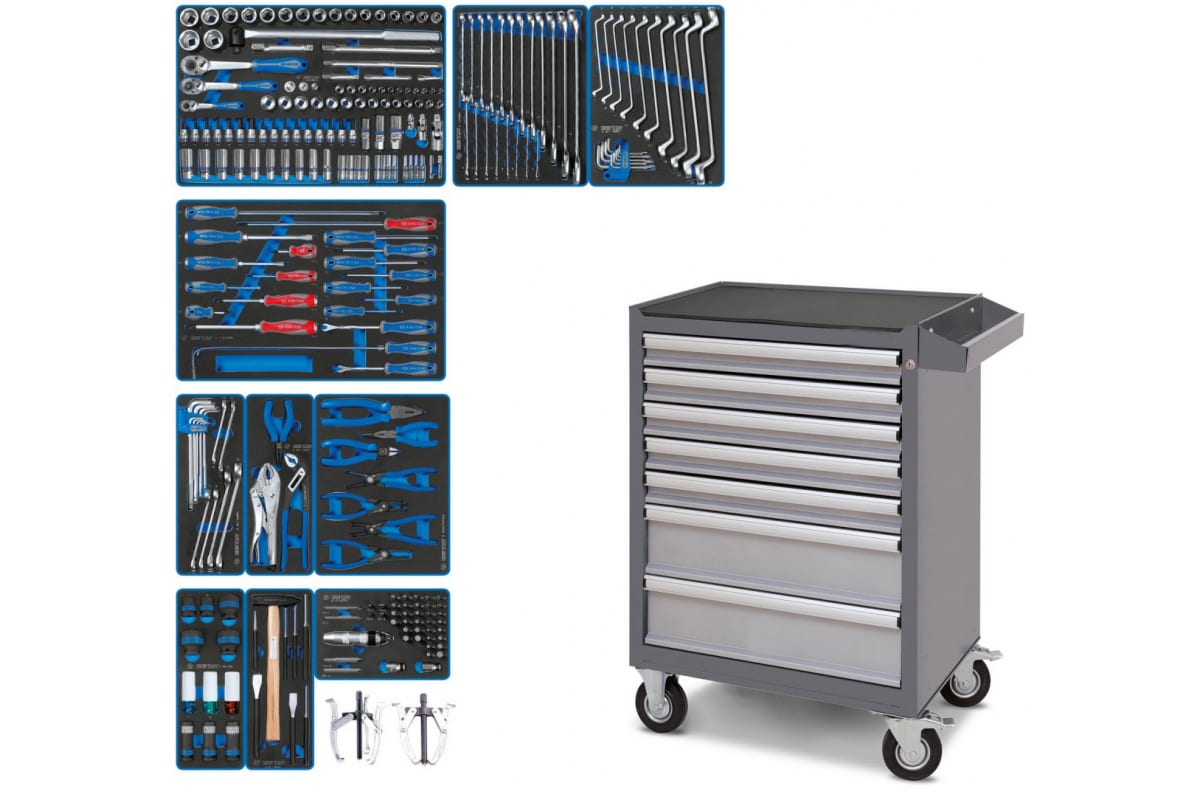 Набор инструментов KING TONY "DRIVE" в серой тележке, 251 предмет 934-251AMG представлен в расширенной комплектации и содержит 251 предмет. Предусмотрен для профессионального использования.