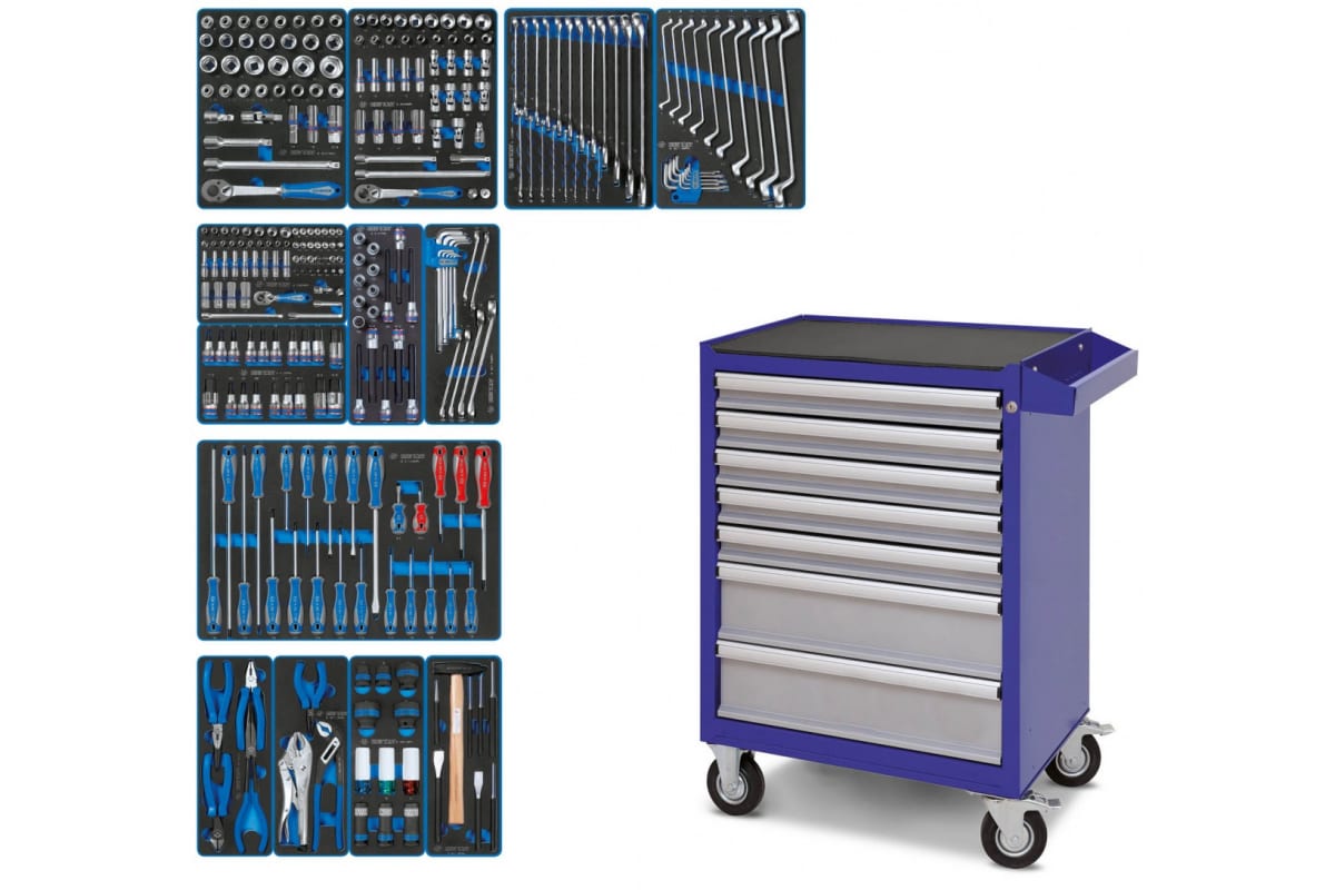 Набор инструментов KING TONY "CLAIM" в синей тележке, 286 предметов 934-286AMB представлен в расширенной комплектации и содержит 286 предметов.