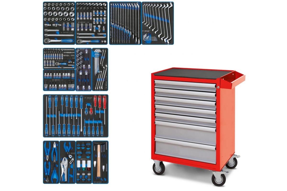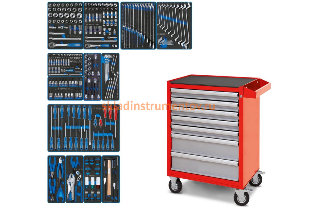 Набор инструментов KING TONY "CLAIM" в красной тележке, 286 предметов 934-286AMR представлен в расширенной комплектации и содержит 286 предметов. Предусмотрен для профессионального использования.