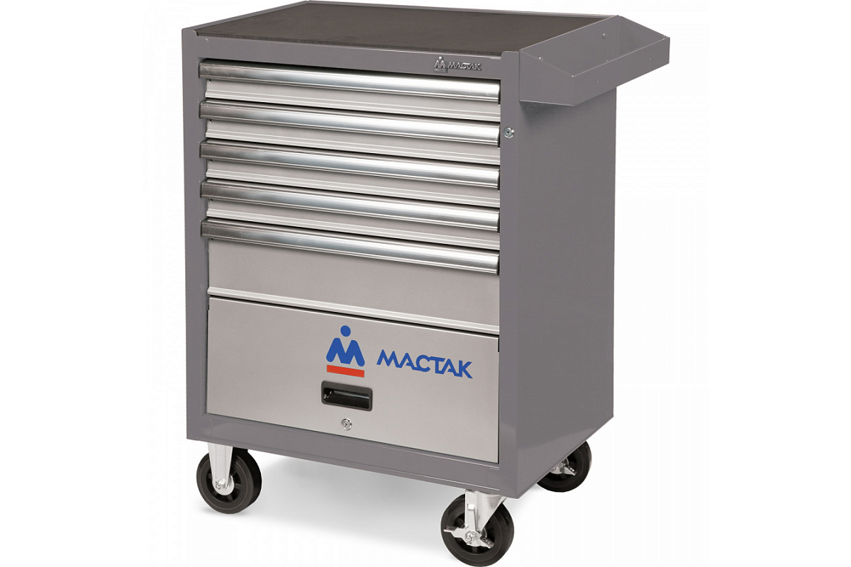 Инструментальная тележка МАСТАК ОПТИМА 5 полок и отсек, серая 522-05581MG имеет 5 выдвижных полок и один отсек для хранения крупных инструментов. Так же это отделение подходит для других рабочих принадлежностей.