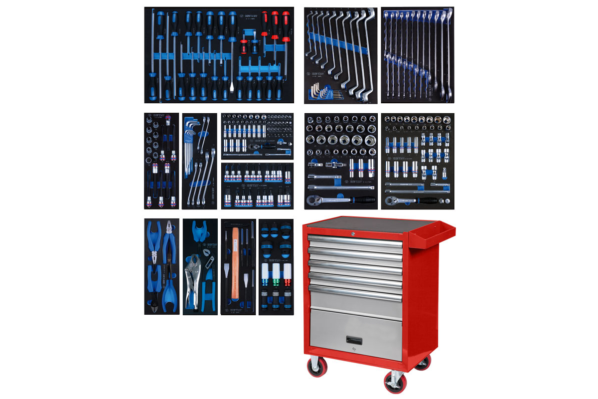 Набор инструментов в красной тележке KING TONY 286 предметов 934-010AMR располагается в 13 ложементах, выполненных из этиленвинилацетата (EVA), который характеризуется повышенной прочностью, устойчивостью к деформациям (восстанавливает свою первоначальную форму), а также к воздействию масел и растворителей.