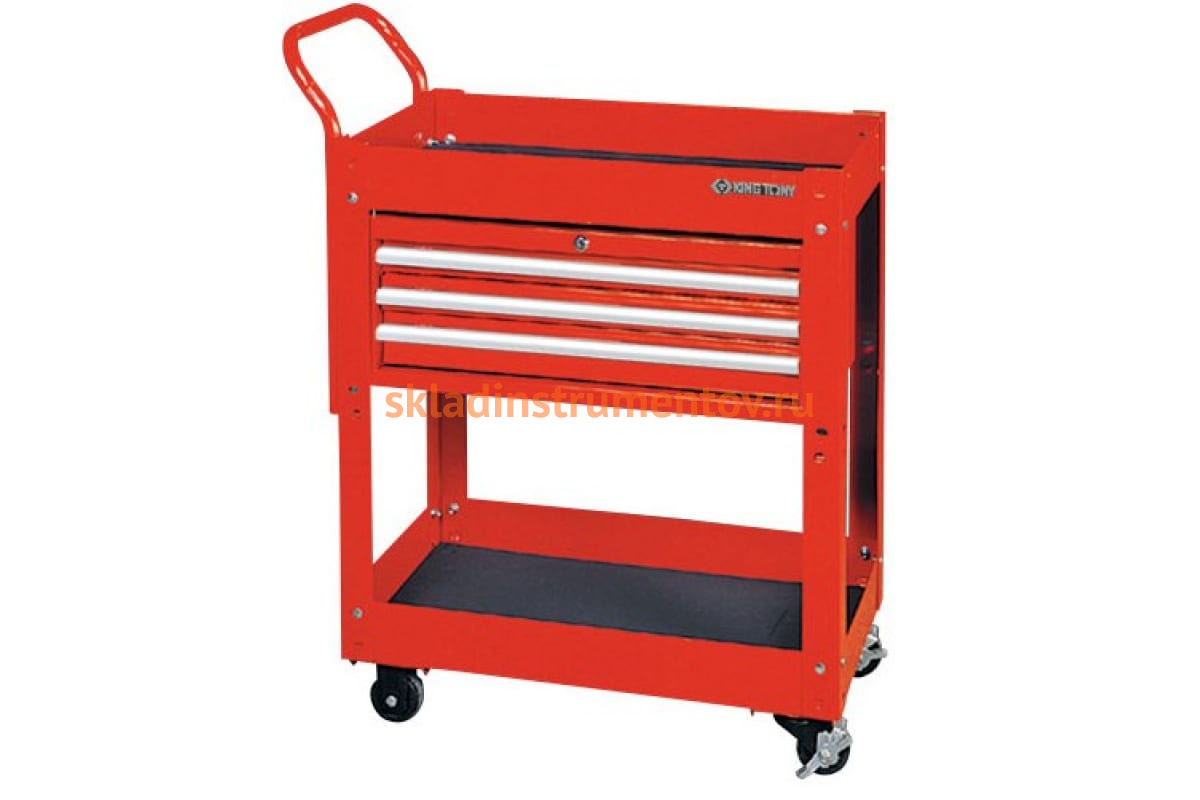 Красная инструментальная тележка (2 полки и 3 ящика) KING TONY 87441-3B служит для упорядоченного хранения приспособлений, оснастки, инструмента в условиях промышленного предприятия, мастерской по ремонту автомобилей, частного гаража. Яркая окраска корпуса делает модель заметной на любой рабочей площадке.