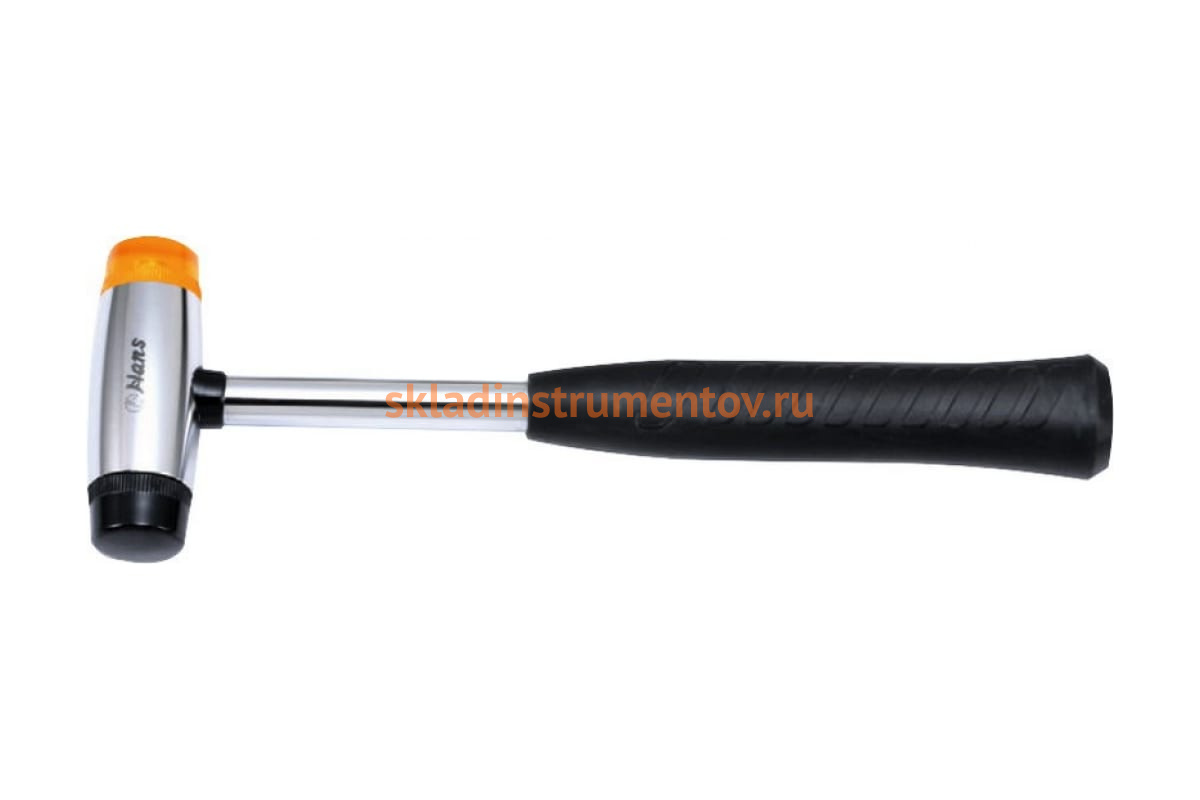 Молоток с мягкой ударной частью 480гр Hans 5701-16 имеет прочную металлическую конструкцию, два мягких бойка и удобную в обхвате рукоятку. Данный инструмент предназначается для проведения рихтовки поврежденных поверхностей или ударных работ с мягкими материалами, где применение обыкновенного слесарного молотка невозможно. Длина молотка - 315 мм.