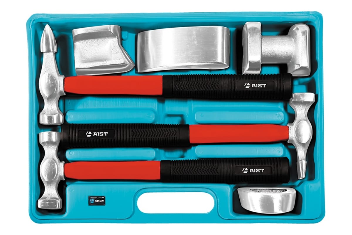 Рихтовочный набор для кузовных работ AIST 7 предметов, в пласт. кейсе 67917007-1 00-00014743 состоит из трех рихтовочных молотков и четырех наковален различных форм и размеров. Наковальни и рабочие части молотков выполнены из прочной и качественной углеродистой стали марки 1055С. Рукоятки инструментов изготовлены из древесины ореха (гикори). Представленный комплект станет надежным помощником для мастера-кузовщика.