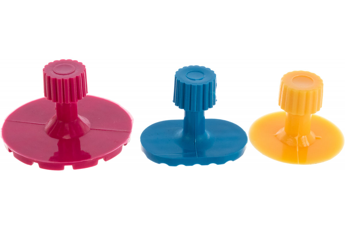 Набор пластиковых адаптеров для беспокрасочного удаления вмятин ROCKFORCE 19 предметов RF-915M1-P включает в себя круглые и прямоугольные элементы, которые монтируются на кузов для вытягивания металла.
