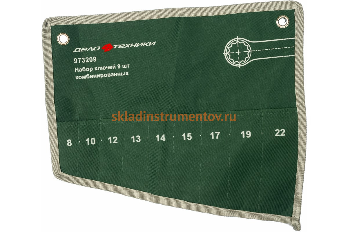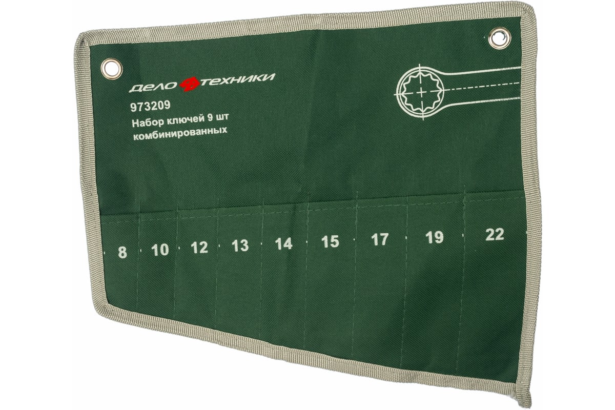 Сумка для набора комбинированных ключей Дело Техники 973209 511091 100/1 имеет девять узких отделений. Облегчает хранение и транспортировку ручного инструмента. Сделана из прочного материала, устойчивого к износу и внешним воздействиям.