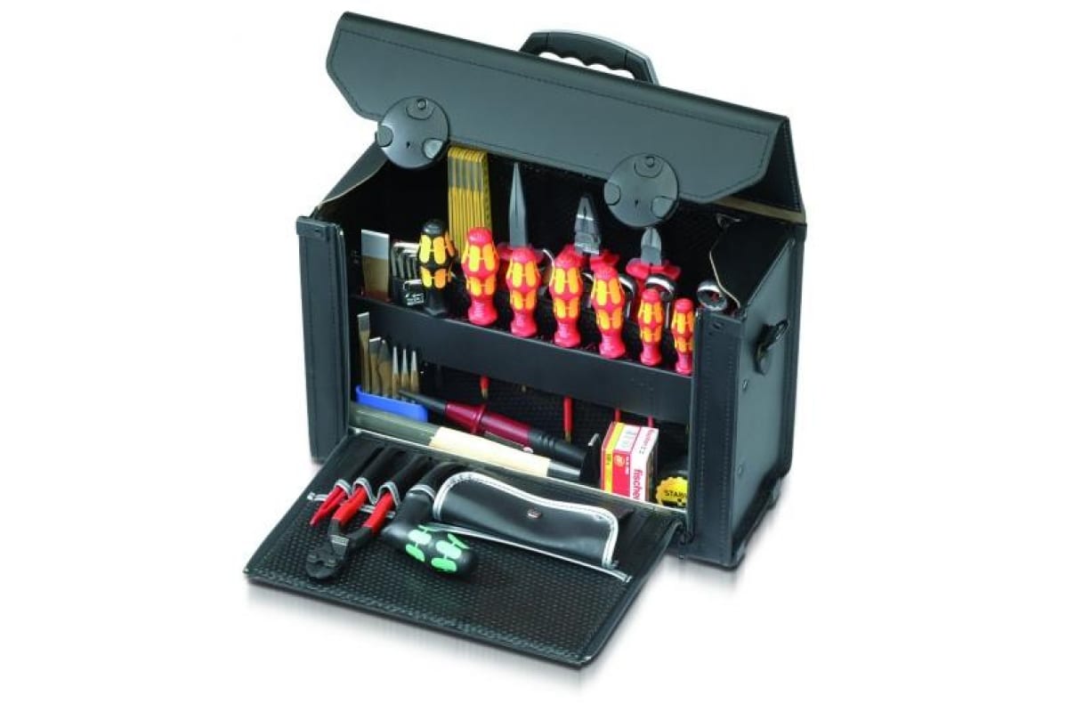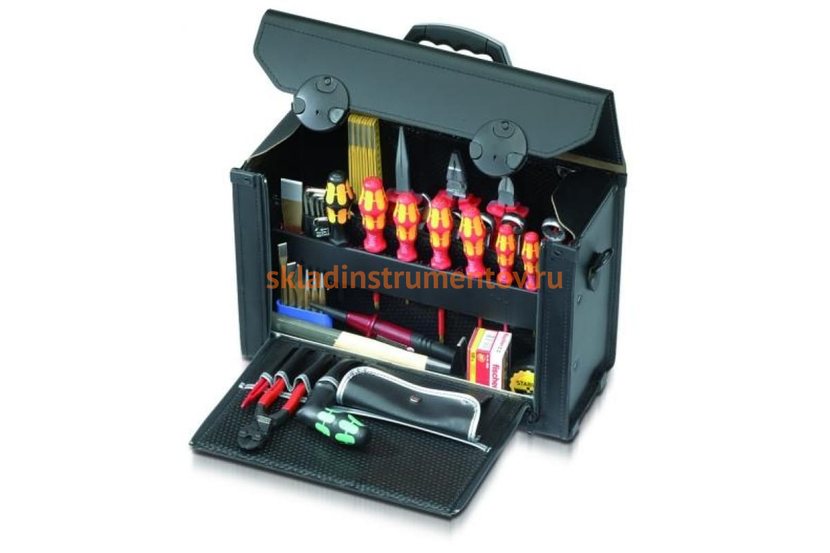 Чемодан PARAT PA-14000581 предназначен для хранения и переноски ручного инструмента. Чемодан черного цвета имеет объем около 19 л и изготовлен из яловичной кожи, панели выполнены из прочного материала Con-Pear. Закрывается с помощью замков с фиксаторами, есть ручка для переноски и скобы для крепления ремня. Передняя стенка откидывается и предоставляет доступ к внутреннему содержимому чемодана. Там находятся четыре отделения, карман для мелких деталей, зажимное отделение, перегородка, три держателя для инструмента CP-7 диаметром 11, 15 и 26 мм. Нижний отсек выполнен из оцинкованной листовой стали. Чемодан выглядит очень солидно, имеет повышенную износостойкость и долгий срок службы. Размер: 275х415х165.