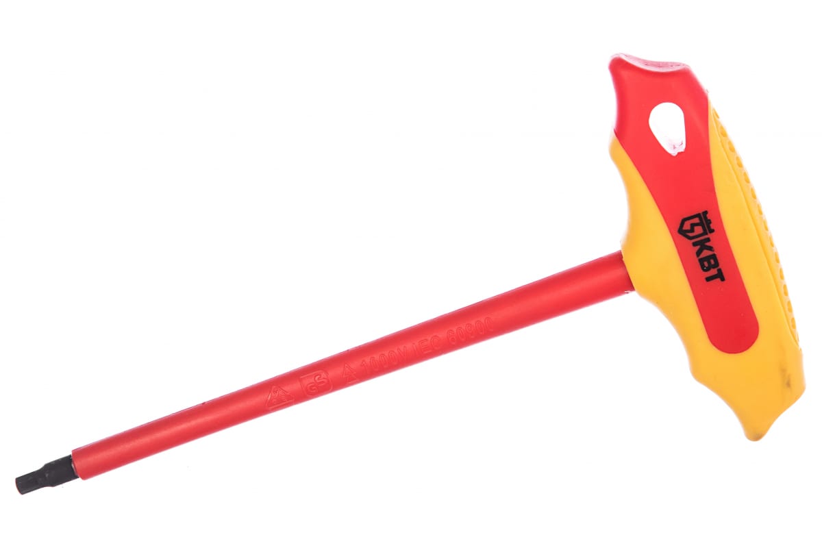 Ключ диэлектрический шестигранный Т-образный 4 мм КВТ Профи 73231 используется при работе с шестигранным крепежом. Удобная форма рукоятки обеспечивает относительно малое приложение силы для вращения крепежа. Инструмент полностью изолирован. Прорезиненное покрытие не скользит в ладони.