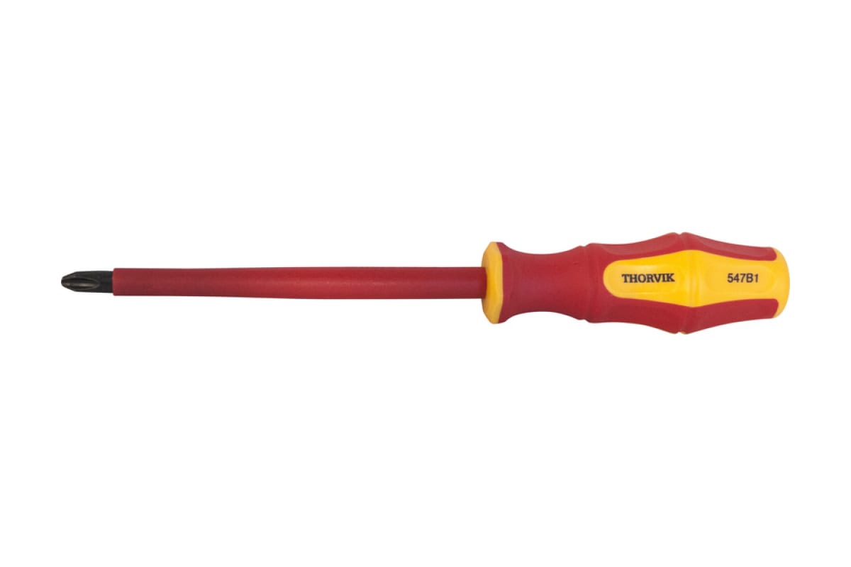 Крестовая диэлектрическая отвертка THORVIK SDPI315 PHILLIPS VDE 1000 v PH3x150 мм 52180 обладает двухкомпонентной маслобензостойкой рукояткой и стержнем из хромованадиевой стали. Инструмент с диэлектрическим покрытием можно использовать под напряжением до 1000 В. Намагниченное жало облегчает работу с крепежом в пазах.