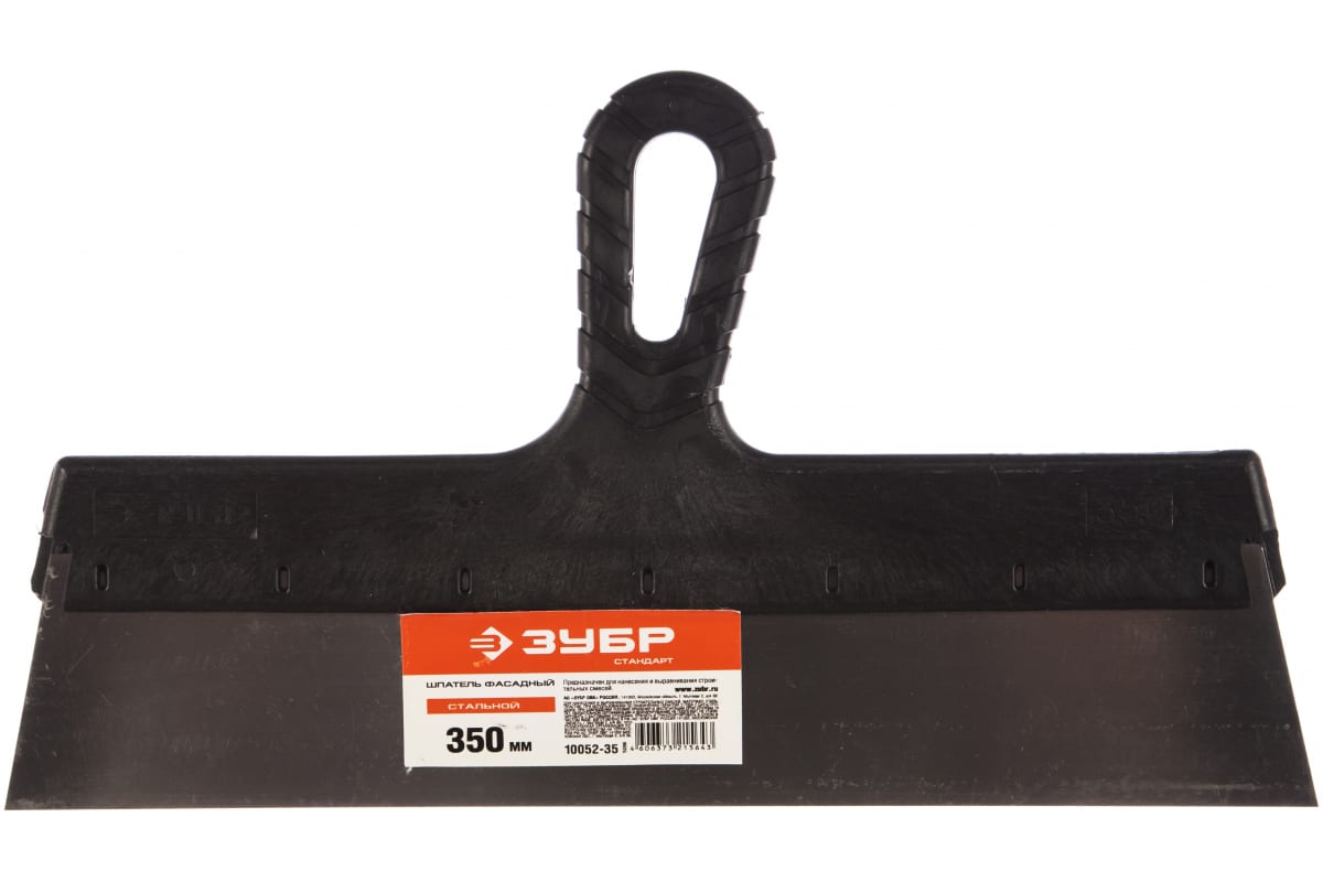 Фасадный шпатель 350 мм Зубр СТАНДАРТ 10052-35 представляет собой ручной инструмент для нанесения и разравнивания строительной смеси на больших площадях. Рабочее полотно изготовлено из стали, благодаря чему отличается прочностью и долговечностью. Пластиковая рукоятка обеспечивает крепкий захват и делает работу более комфортной.
