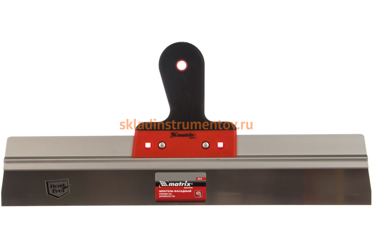 Фасадный шпатель из нержавеющей стали, 475 мм, двухкомпонентная ручка MATRIX 85518 представляет собой удобный инструмент для качественной отделки поверхностей.