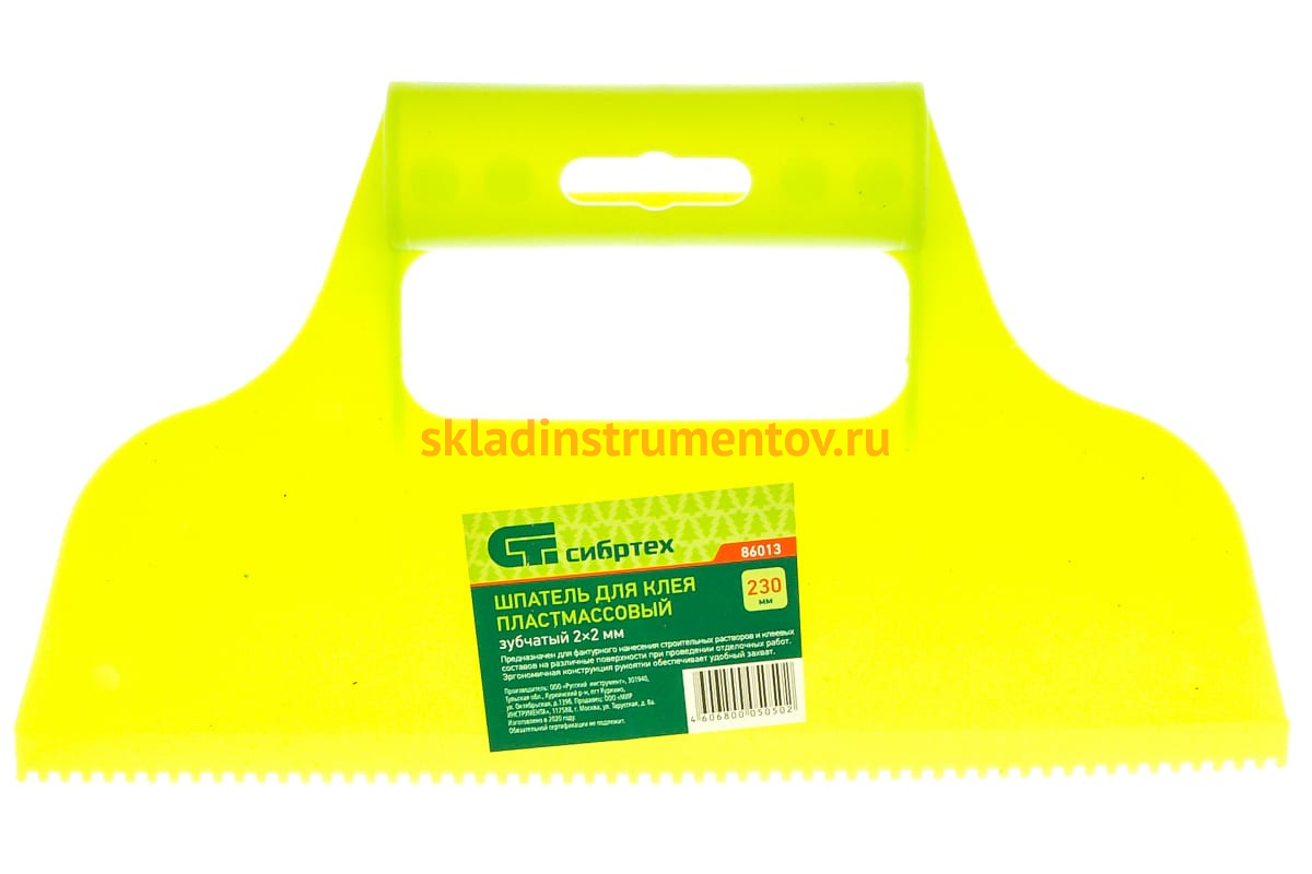 Пластмассовый шпатель для клея СИБРТЕХ зубчатый 2х2 86013 используется при проведении отделочных работ, например для нанесения клеевого раствора. Зубчатое лезвие 2х2 мм позволяет равномерно распределять строительную смесь. Шпатель изготовлен из пластика и оснащен удобной рукояткой.