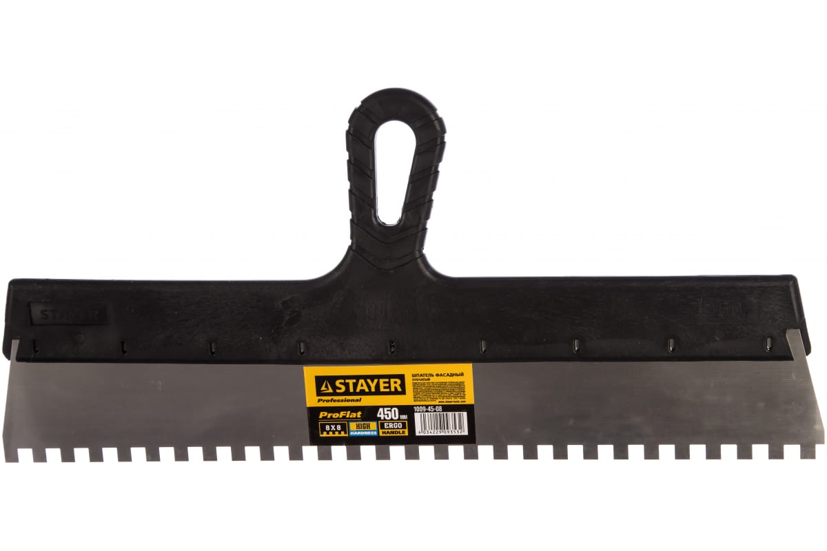 Нержавеющий зубчатый шпатель с пластмассовой ручкой, 450мм, зуб 8х8мм STAYER 1009-45-08 служит для малярных работ. Оснащен полотном из прочной нержавеющей стали и пластмассовой рукояткой, которая обеспечивает практичное применение и надежный захват. Зубья на полотне позволяют лучше распределять строительную смесь на рабочую поверхность.