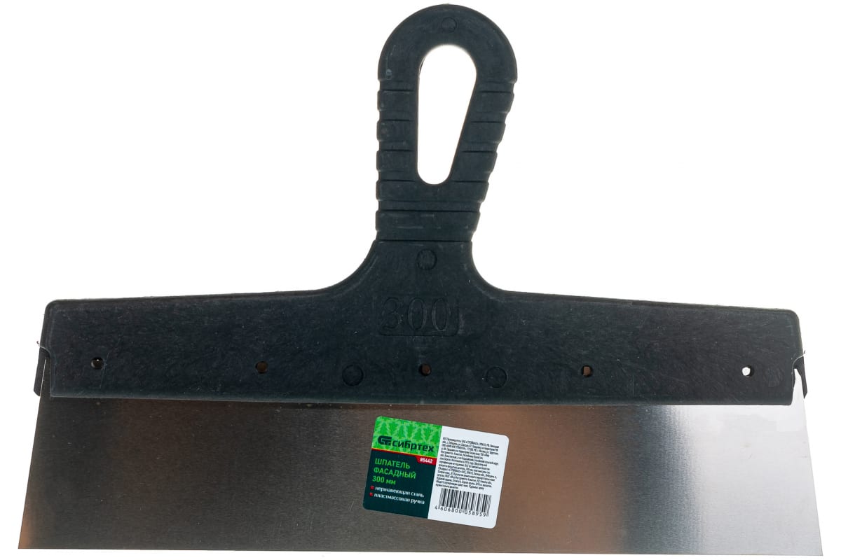 Фасадный шпатель 300 мм СИБРТЕХ 85442 используется для нанесения и равномерного распределения строительных смесей на различных поверхностях. Подходит как для внутренней, так и для наружной отделки. Инструмент состоит из рифленой отогнутой рукоятки и стального рабочего полотна. Шпатель отличается повышенным рабочим ресурсом, его ручка выполнена из ударопрочной пластмассы, а лезвие - из нержавейки.