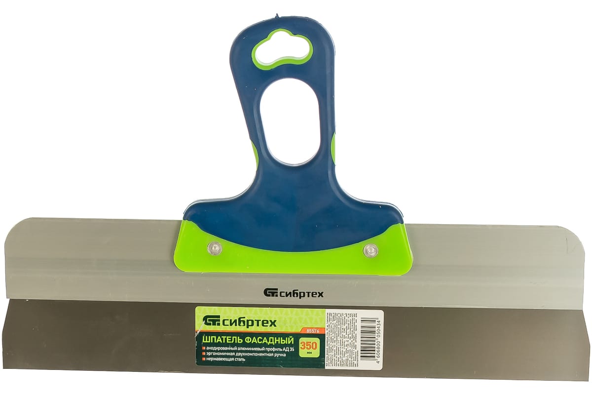 Фасадный шпатель СИБРТЕХ нержавеющая сталь 350 мм 85576 используется в ремонтно-строительных работах. Полотно изготовлено из нержавеющей стали, имеет ширину 350 мм и оснащено алюминиевым ребром жесткости для защиты от искривления рабочей части. Двухкомпонентная рукоятка обеспечивает надежный и удобный захват и обладает отверстием для подвешивания инструмента.