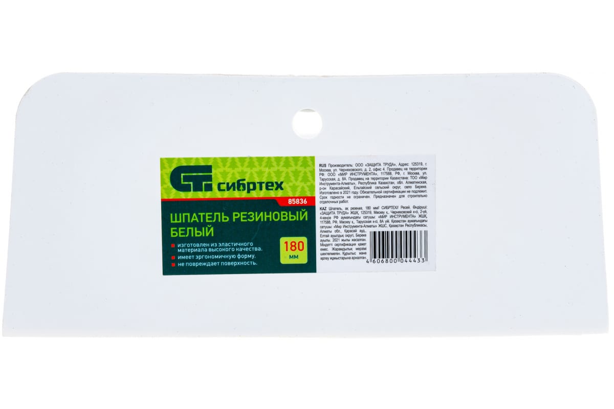 Шпатель СИБРТЕХ белая резина 180 мм 85836 представляет собой инструмент для проведения финишных работ. Изделие изготовлено из белой резины, эластичного материала, который не повреждает поверхность при затирке межплиточных швов. Шпатель имеет эргономичную форму.