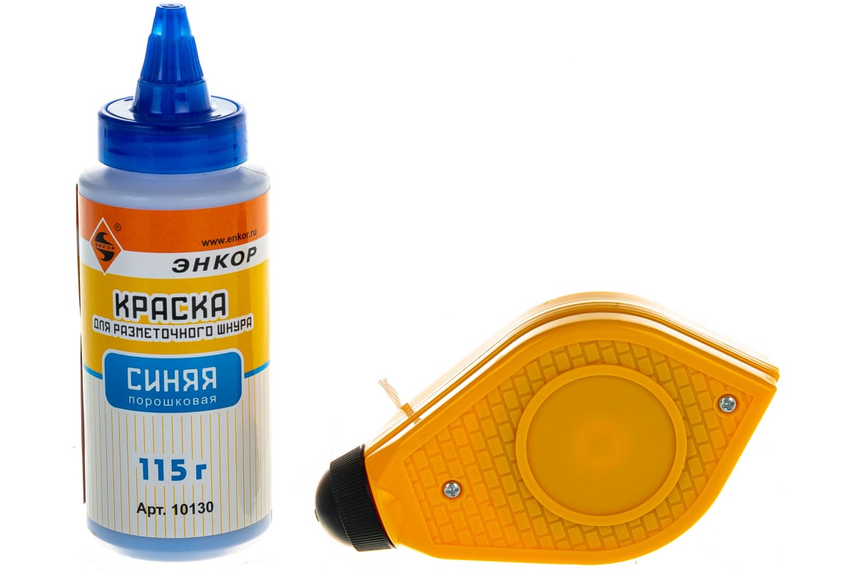 Разметочный набор (краска синяя) Энкор 10125 включает в себя прочный хлопковый шнур, который помещен в корпус из АВС пластика, и порошковое красящее вещество (115 г). Благодаря крючку для закрепления начальной точки разметка потолка, пола или стен осуществляется максимально легко и быстро. Рукоятка эргономичной формы способствует удобной намотке и разматыванию нити.