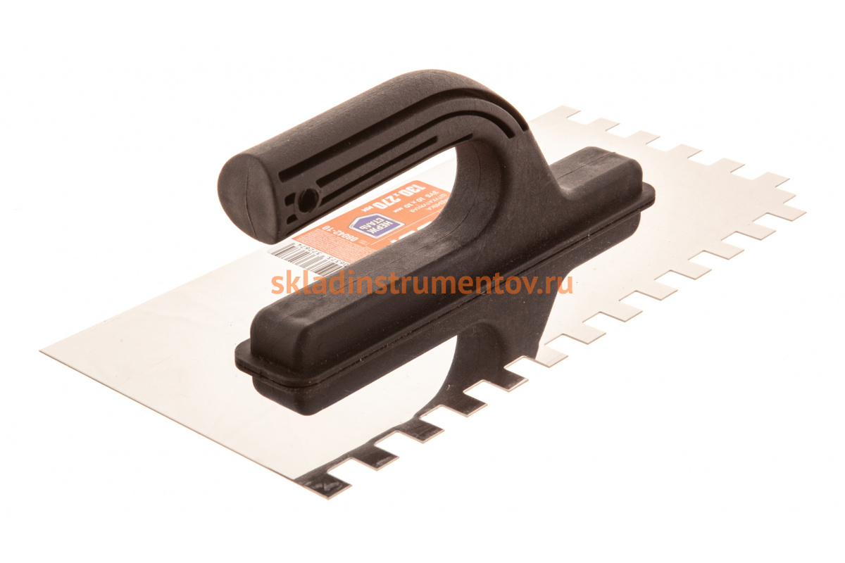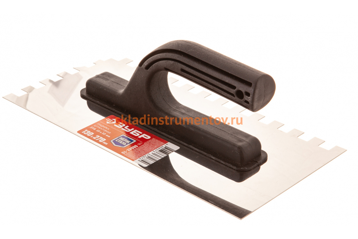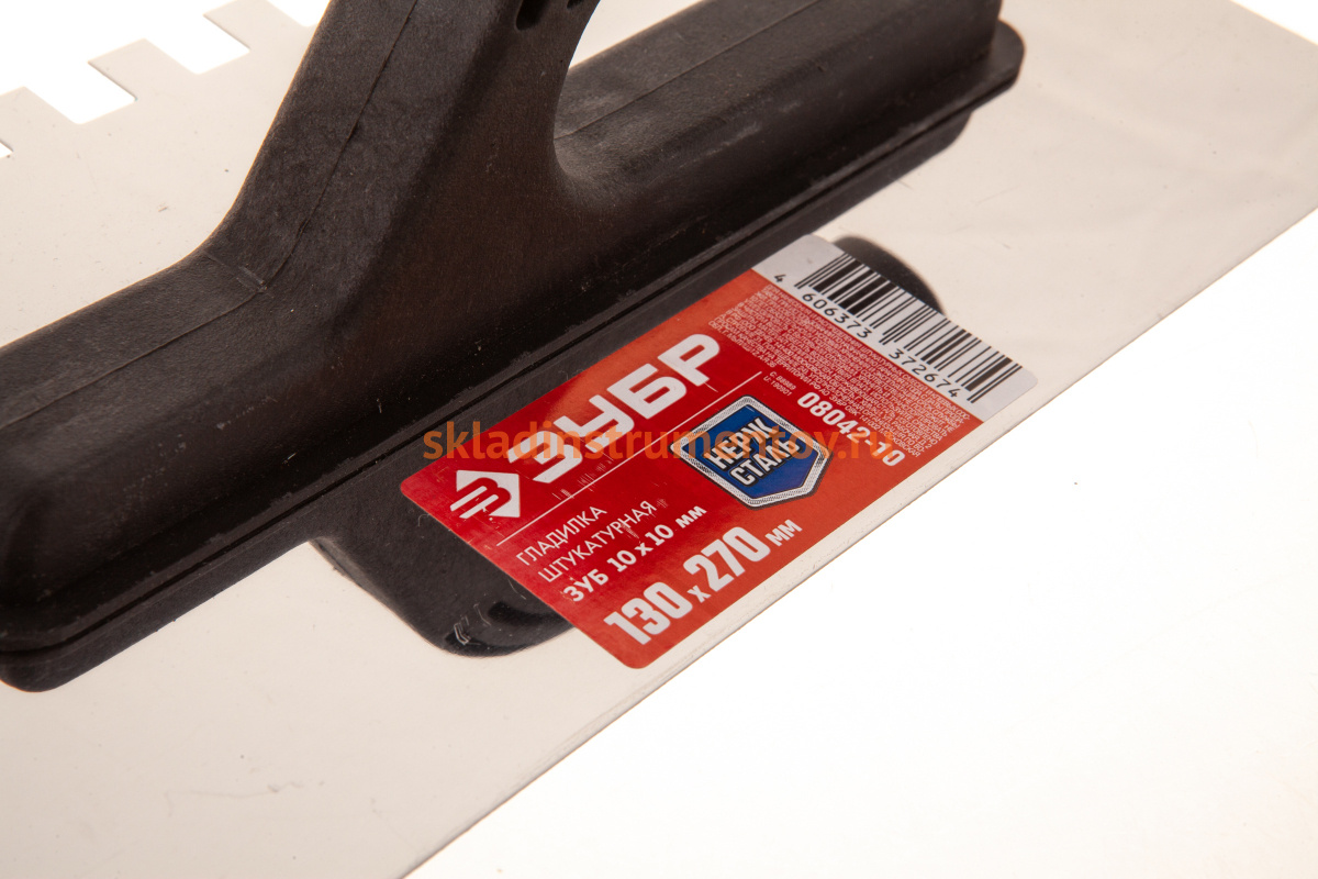 Гладилка Зубр Мастер 130x270мм, 10x10 мм, штукатурная зубчатая нержавеющая с пластиковой ручкой 08042-10 оснащена зеркальным отполированным нержавеющим полотном, что обеспечивает надежность конструкции и отличную коррозиестойкость. Удобная пластиковая рукоять гарантирует комфортную работу при нанесении и распределении штукатурных смесей и клеевых составов.