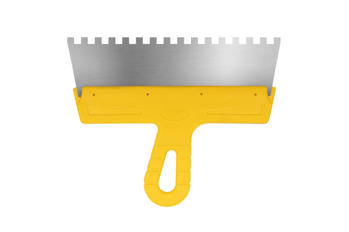 —Фасадный зубчатый шпатель (250 мм, нержавеющая сталь, 8 мм, желтая ручка) Biber МАСТЕР 35186 тов-176013