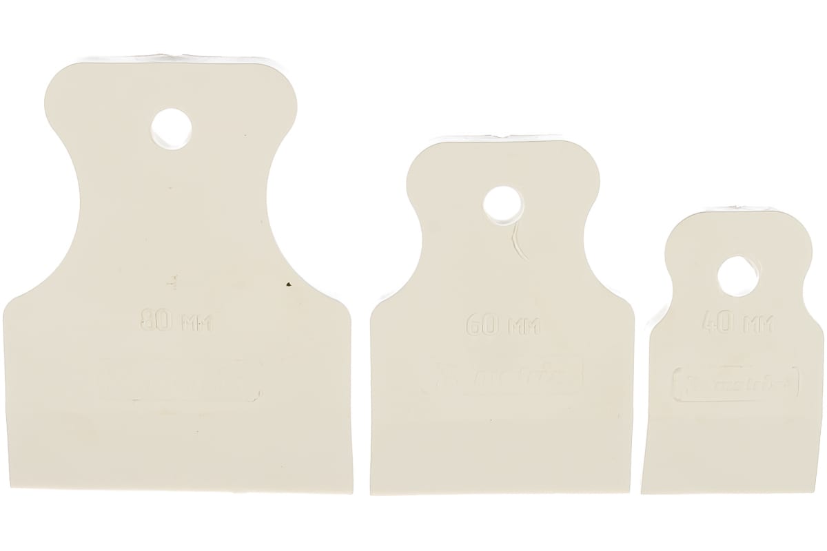 Набор шпателей 3 шт MATRIX 858275 предназначен для нанесения верхних слоев шпаклевки на поверхность, для затирки швов или скрытия небольших неровностей. Шпатели выполнены из гибкого и прочного материала - резины. Набор из трех шпателей с размерами 40, 60 и 80 мм позволит с легкостью производить точные работы. На шпателях расположены отверстия - можно хранить их в подвешенном состоянии.