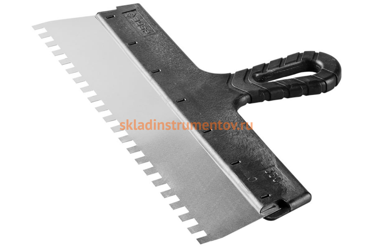 Фасадный зубчатый шпатель 350 мм Зубр МАСТЕР 10078-35-10 состоит из нержавеющего стального полотна и удобной пластиковой рукоятки. Он является ручным инструментом, использующимся для нанесения клеевых составов на поверхность при отделочных работах. Рабочая часть снабжена зубьями 10х10 мм, которые позволяют равномерно наносить и распределять смесь. Шпатель прост и удобен в обращении.