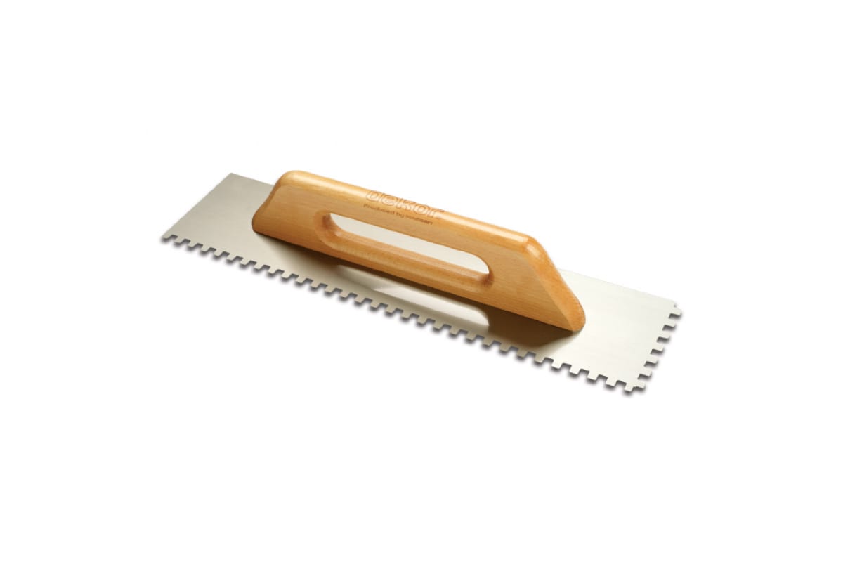 Зубчатый полутер DEKOR HASSAN 120 х 500 мм квадратный зуб 12 х 12мм деревянная ручка 840 имеет увеличенную жесткость за счет двухстороннего крепления рукояти. Это позволяет равномерно распределять состав без утолщений и ровнее укладывать плитку.