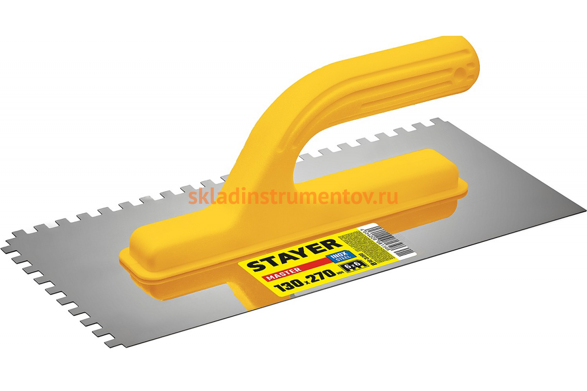 Штукатурная зубчатая нержавеющая гладилка с пластиковой ручкой Stayer Master 130x270 мм, 6x6 мм 08012-06_z01 подойдет для быстрого выравнивания слоя плиточного клея или любого другого состава.