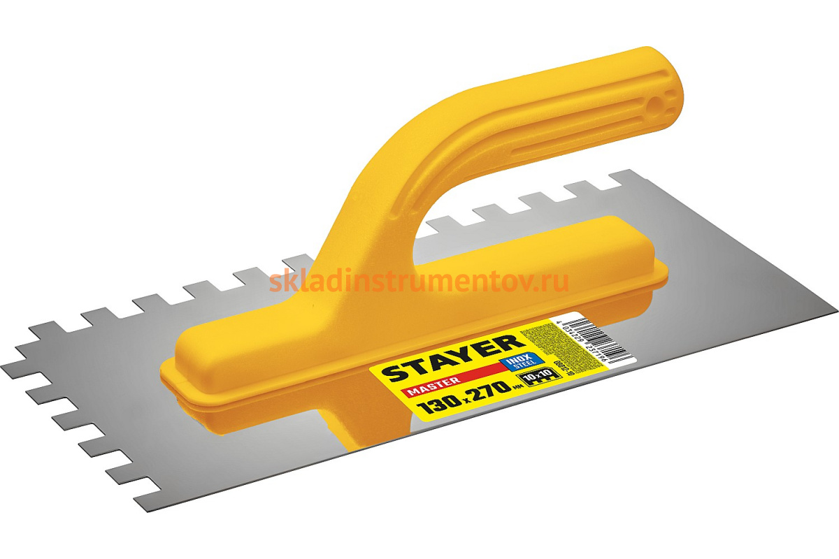 —Штукатурная зубчатая нержавеющая гладилка с пластиковой ручкой Stayer Master 130x270мм, 10x10 мм, 08012-10—