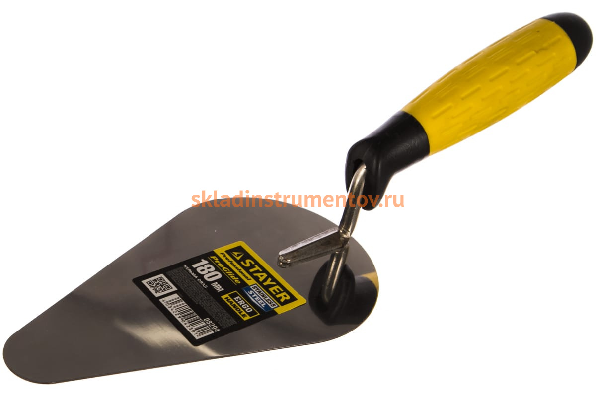 Кельма STAYER ПРОФИ 08294 выполнена в форме овала размером 180х95 мм. Такая кельма применяется для перемешивания растворов, кладки кирпича и нанесения штукатурно-отделочных материалов на обрабатываемую поверхность. Длительный срок эксплуатации кельмы обеспечивается за счет надежности конструкции из нержавеющей стали.